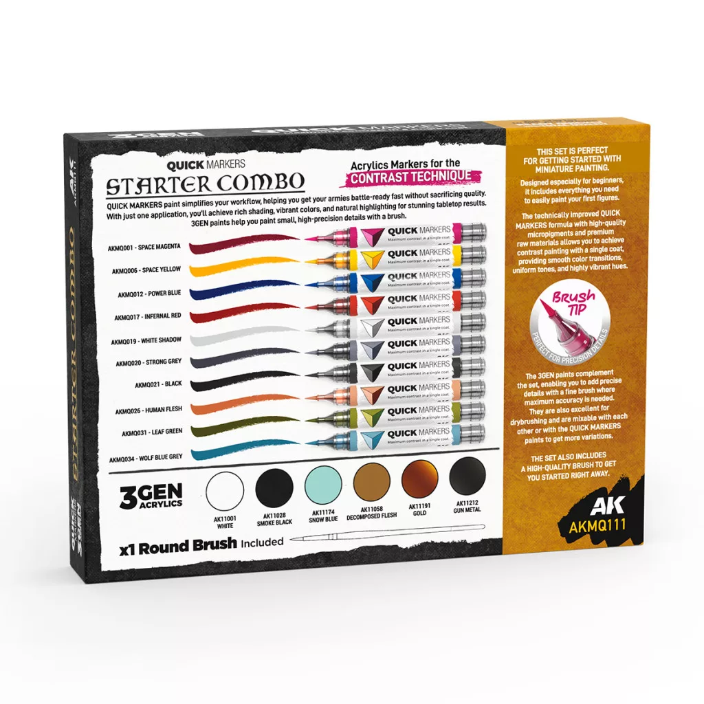Az AK Interactive Starter Combo Quick Markers + 3GEN Set egy átfogó, kezdők és haladók számára egyaránt ideális festőkészlet, amely a gyors festést biztosító Quick Marker technológiát kombinálja a klasszikus 3GEN akril festékekkel. A készlet célja, hogy a teljes festési folyamatot lefedje az alapoktól a részletek kidolgozásáig, így egyetlen csomaggal komplett megoldást kapsz miniatűrök festéséhez.