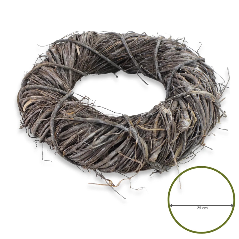 A Madagaszkár koszorúalap natúr 25 cm egy masszív, természetes hatású koszorúalap, amely ideális kiindulópont ajtódíszek, falidekorációk vagy kreatív koszorúk készítéséhez. A természetes vesszőből és indákból készült fészek-szerű kialakítás karakteres, rusztikus hangulatot ad minden dekorációnak, miközben stabil, megbízható alapot biztosít a ráhelyezett díszeknek.