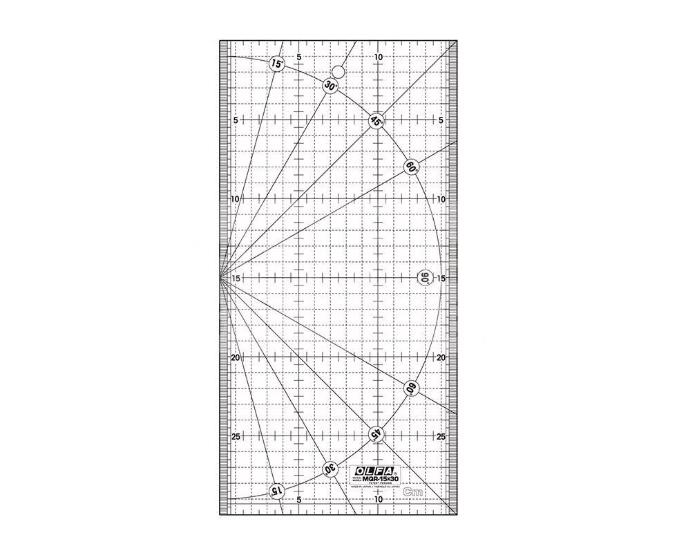 OLFA MQR-15x30 - Patchwork vonalzó. 15 x 30 cm-es, matt, akril felületű patchwork vonalzó. Jellemzői: a sötét és világos színű anyagoknál is könnyen leolvasható számok, centiméteres rácsvonal, valamint szögbeosztások.