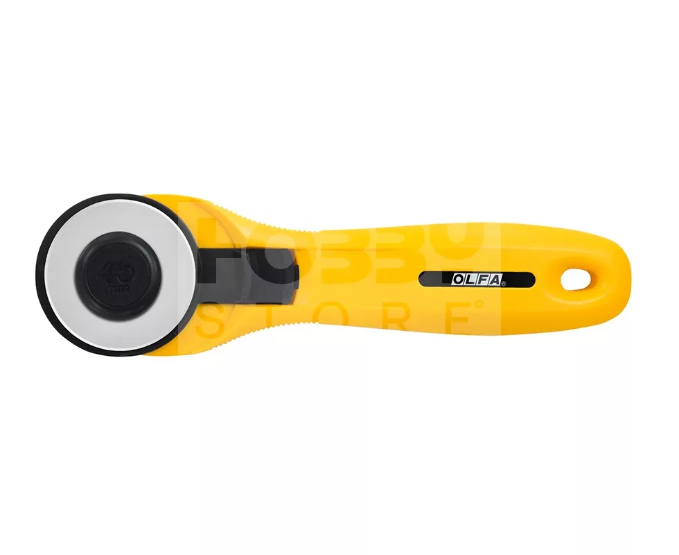 OLFA RTY-1/C - Textilkés. Széles markolatú 45 mm-es rozsdamentes  körpengével szerelt foltvarró / patchwork kés / textilkés. Patentes mechanikájának köszönhetően egyszerű a pengecsere. A sérülések elkerülése végett műanyag pengevédővel van ellátva