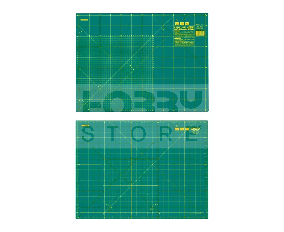 OLFA A2-es méretű speciális három rétegű öngyógyuló vágólap. A vágóalátét egyik oldala inch, másik oldala centiméter beosztású, valamint a leggyakrabban használt szögek is jelölve vannak rajt.