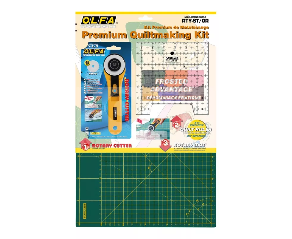 OLFA RTY-ST/MQR - Foltvarró / Patchwork induló készlet. A foltvarró csomag tartalma: 1db OLFA RM-IC-C 1,5mm vastag vágóalátét, 1db OLFA RTY-2/G 45mm-es patchwork kés és 1db OLFA MQR-15x16 cm-es patchwork vonalzó.