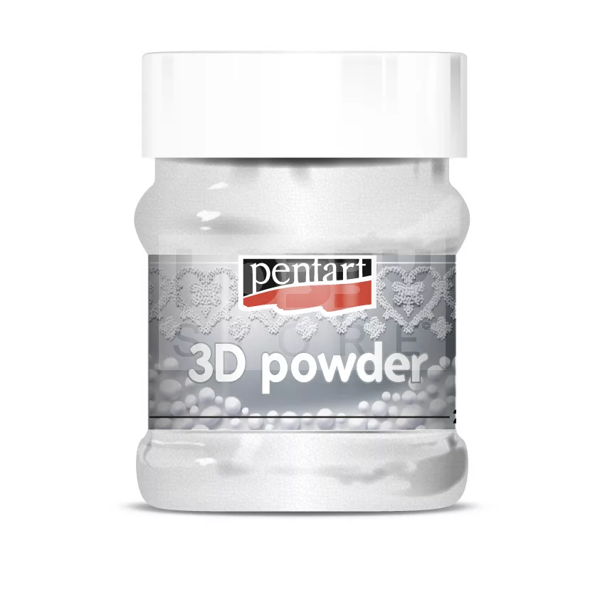 A különböző szemcseméretű 3D por segítségével munkánk színvilágához igazodva készíthetünk térhatású felületet. Keverjük a kiválasztott szemcseméretű 3D port a megfelelo színű PENTART akrilfestékbe, majd a kapott masszát vigyük fel a díszítendő felületre. A felvitel történhet ecsettel, spatulával, sablonnal, de tölthetjük csorös tubusba és így tetszoleges rajzolatot is készíthetünk. A bekevert massza gyorsan beszárad, ezért mindig csak annyit keverjünk össze, amennyit felhasználunk!