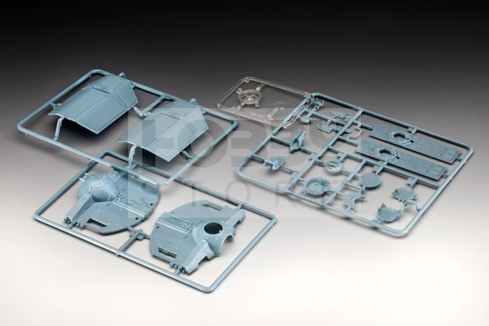 Festést és ragasztást igénylő műanyag makett. A készlet az alap színeket (Revell Aqua Color), ragasztót illetve ecsetet tartalmaz.