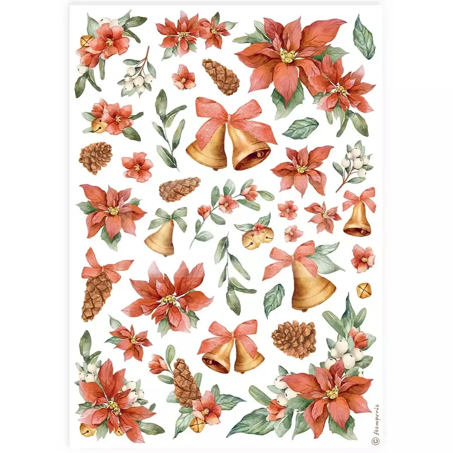 Stamperia A4 rizspapír csom. - Classic Christmas poinsettia and bells - DFSA4921