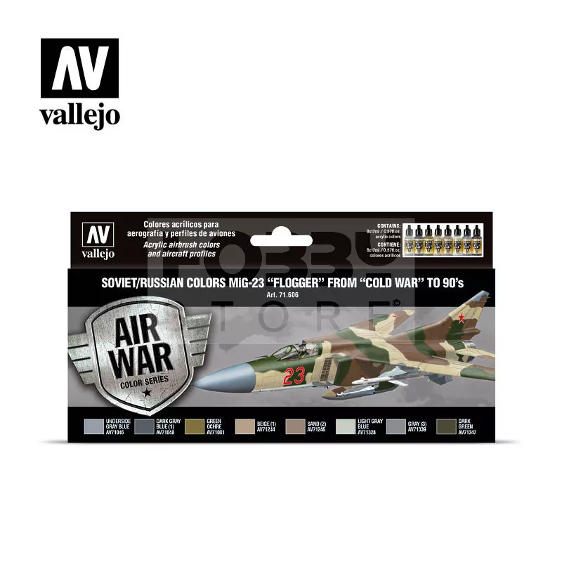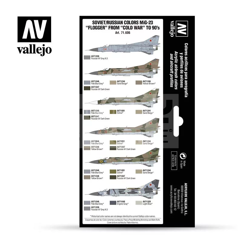 Set with Model Air color developed to paint the different models of the MiG-23 “Flogger” of the Soviet Air Force deployed during the “Cold War”. The set includes profiles of the aircraft, indications of the colors needed and a detailed description of their application.