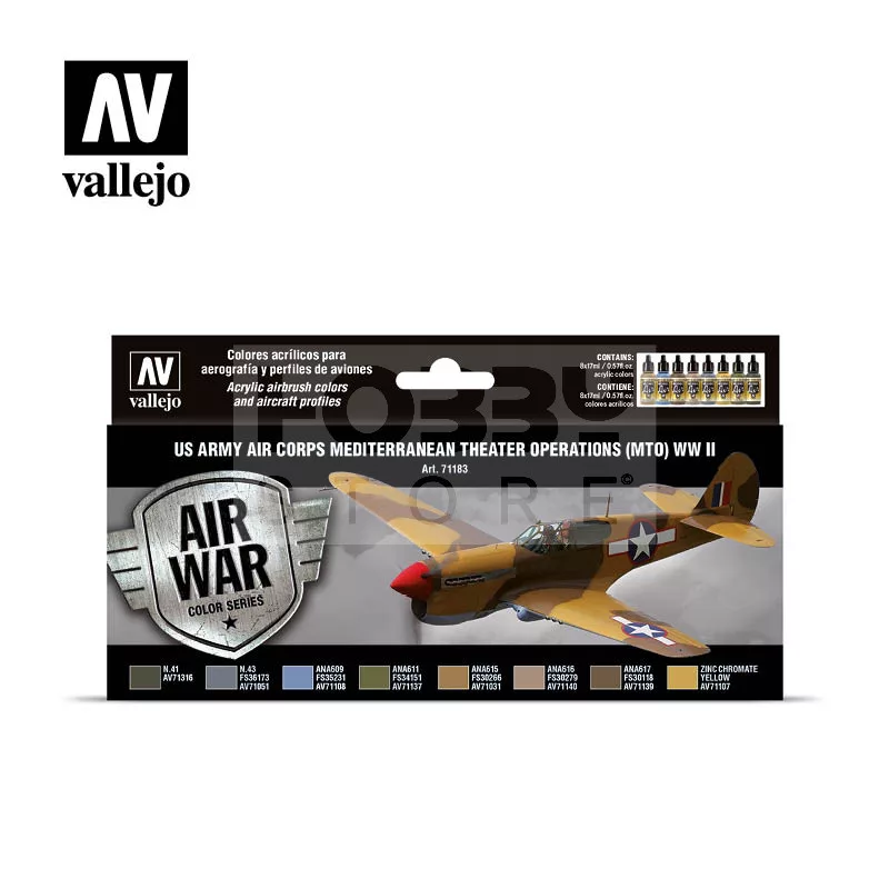 Vallejo Model Air festékeket tartalmazó tematikus szett a II: Világháborús US ARMY CORPS MTO hadszíntéren használt gépek álcájának megfestéséhez.