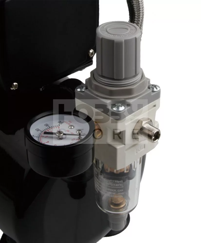 Single piston oil-free compressor Mini is equipped with the air reservoir (pressure vessel) and the regulator of the output pressure of the filter and manometer (pressure gauge).